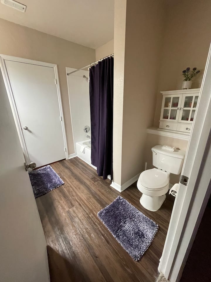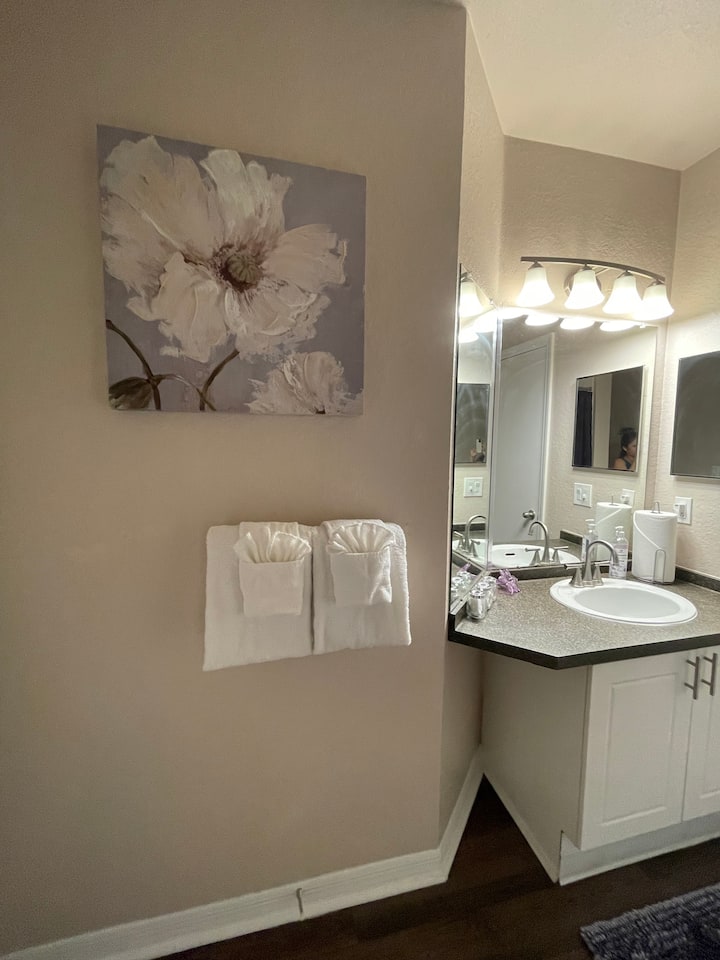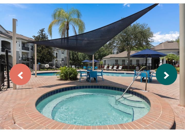Chumba 1 cha kulala na Bafu 1 la kujitegemea katika kondo ya 2/2. Eneo hili linakuwezesha kuchunguza kwa urahisi Disney, Sea World, Universal na sehemu nyingi za utalii za Orlando, tembelea mikahawa yake, maduka na vivutio. Dakika 20 tu kutoka uwanja wa ndege wa kimataifa wa Orlando.