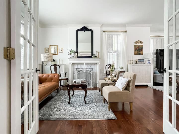Sehemu ya kuishi kwenye ghorofa kuu ni sehemu ya sakafu iliyo wazi inayopanua upande mzima wa nyumba, ikionyesha meko ya zamani na sakafu za mbao ngumu.