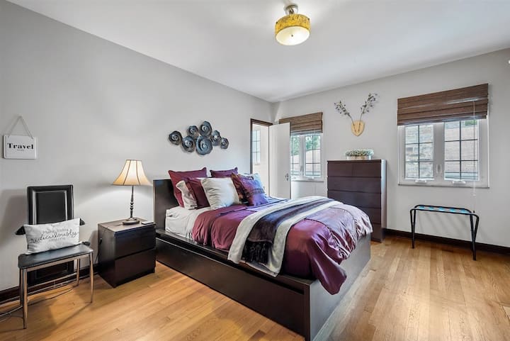 ✔ Pumzika katika chumba kikubwa cha kulala, kilicho na kitanda cha kifahari cha ukubwa wa kifalme, baiskeli ya mazoezi, vyombo viwili vikubwa vya kujipambia na kabati la nguo.