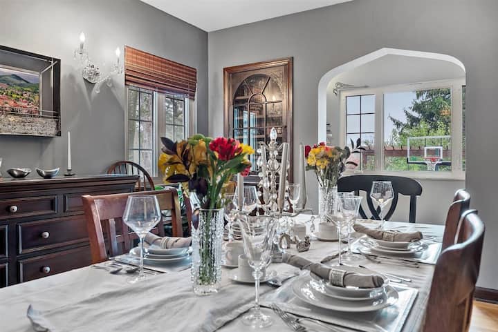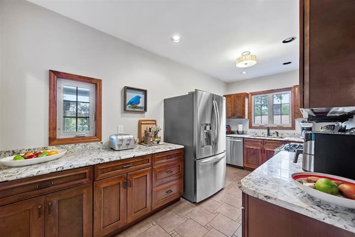 Jiko lenye vifaa ✔ vya kutosha na chumba rasmi cha kulia chakula ni bora kwa ajili ya jasura za mapishi, kilicho na vifaa vya chuma cha pua, vifaa vya kupikia na kila kitu unachohitaji ili kuandaa na kufurahia milo.