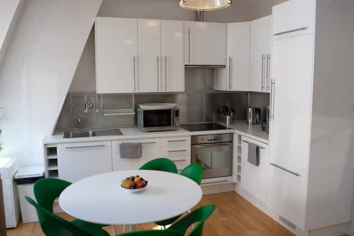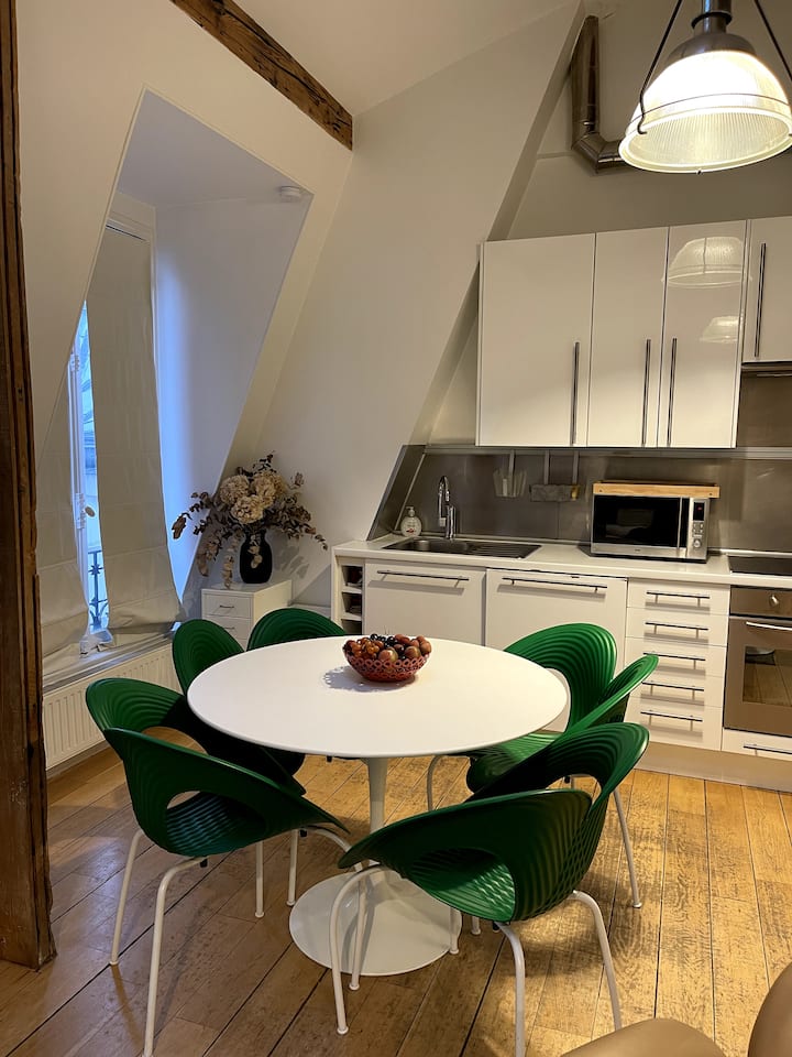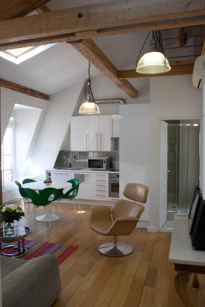 Nyumba ya kifahari yenye kimo kikubwa chini ya dari (mita 5) ikiwa ni pamoja na vyumba 2, chumba kimoja cha kulia kilicho na nafasi kubwa, jiko la Marekani lenye vifaa, bafu moja, vyoo, ofisi moja ya nafasi, mavazi makubwa. Tulivu na yenye starehe sana na muundo wa kisasa sehemu hiyo inafaidika kutokana na mwangaza mwingi kutokana na kufunguliwa kwenye paa (madirisha 6 ya paa) na madirisha mengi.