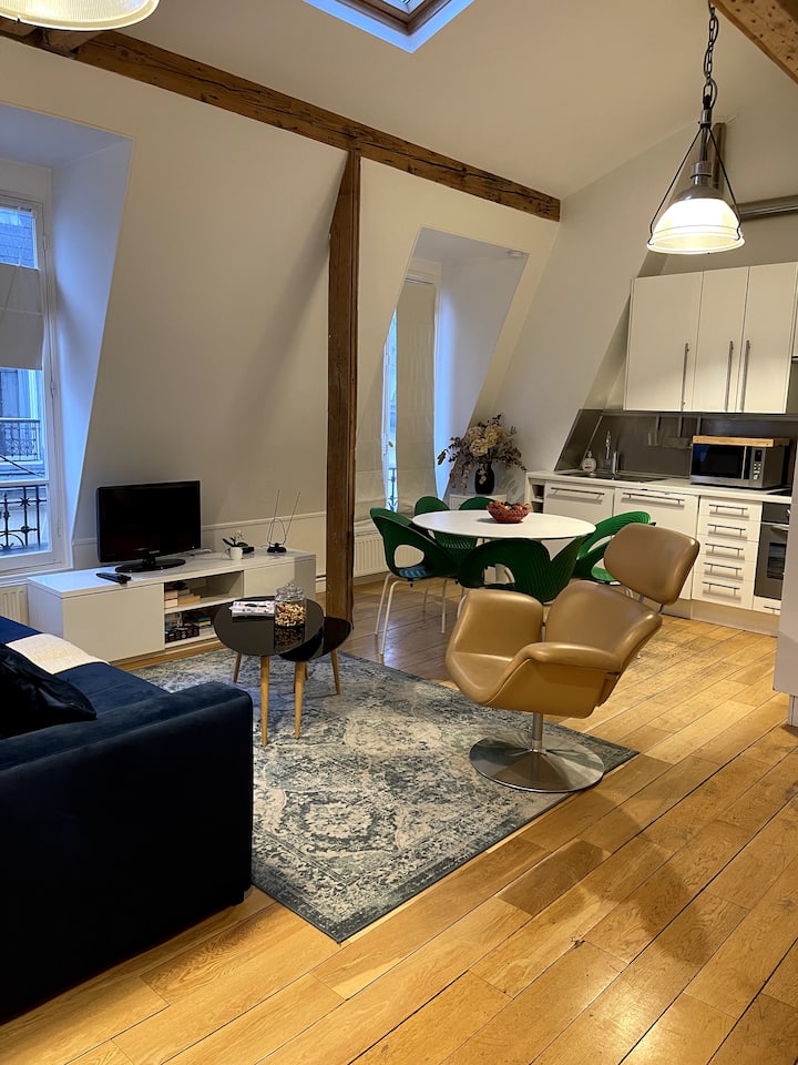 Iko katikati ya Paris, fleti hii ni mbingu ya amani katikati ya eneo linalothaminiwa sana. Tembea katika mitaa ya watembea kwa miguu ya kitongoji cha Montorgueil, na ujaribu "njia ya maisha ya Paris" kwa kufurahia mikahawa mingi na maduka maarufu ya brashi, maduka na kwa kufanya ununuzi wako wa chakula safi sokoni. Unaweza kufurahia urahisi huu wote chini ya jengo: masoko ya chakula, vyakula, mikate, duka la bucha, duka la samaki nk….