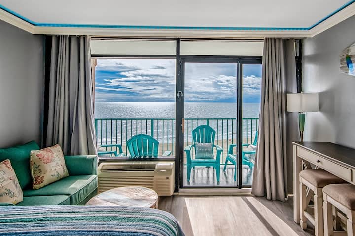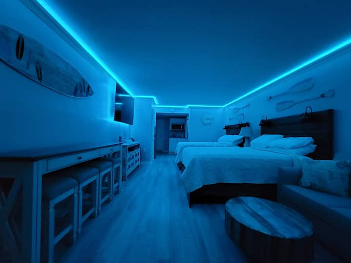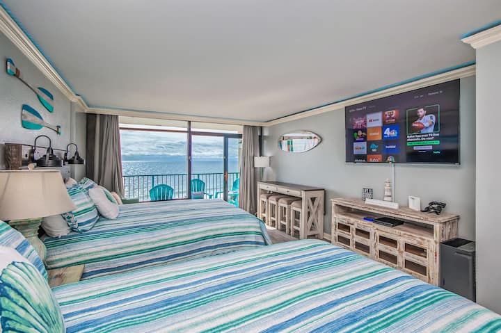 Karibu nyumbani kwenye chumba chetu cha studio kilichopangwa hivi karibuni ili kufanya likizo yako ya pwani moja iliyojaa furaha na utulivu! Sehemu nzuri ya kukaa iliyo na kiti cha kulala na meza ya kahawa ni mahali pazuri pa kupumzika baada ya siku ya kujifurahisha kwenye jua. TV kubwa ya skrini ya 70"na programu kwenye akaunti zako za utiririshaji unazozipenda kama Netflix, Prime Video na Hulu huzunguka chaguzi zako za burudani kwa usiku wa familia. Leta michezo yako ya PS4 ukiwa nyumbani na ufurahie kwenye koni yetu.