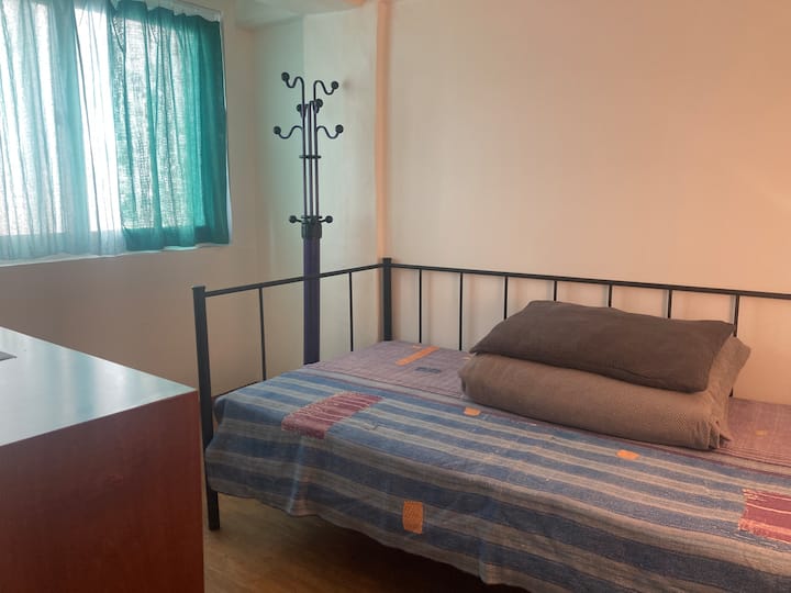 Unatumia jiko, sebule, bafu na chumba cha 1, na kuna kitanda kimoja sana chumbani, kiti cha fito na kabati la nguo na vitu vyako vizuri.