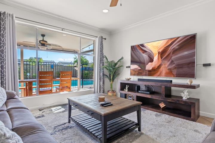 Furahia maudhui ya moyo wako na nafasi kubwa kwa ajili ya vita vya mchezo wa bodi kwenye meza ya kulia chakula ya viti 6 au snuggle up na wapendwa wako kwa marathon ya sinema na 75" HDTV ikiwa ni pamoja na Chromecast na DirecTV. Kama siku inatoa njia ya jioni, meko ya ndani ya kuni inajaza chumba na mwanga wa joto, inayosaidia zaidi na baridi ya divai na bar maridadi ambayo inasimama tayari kufurahia bevy ya kuburudisha ya uchaguzi wako.