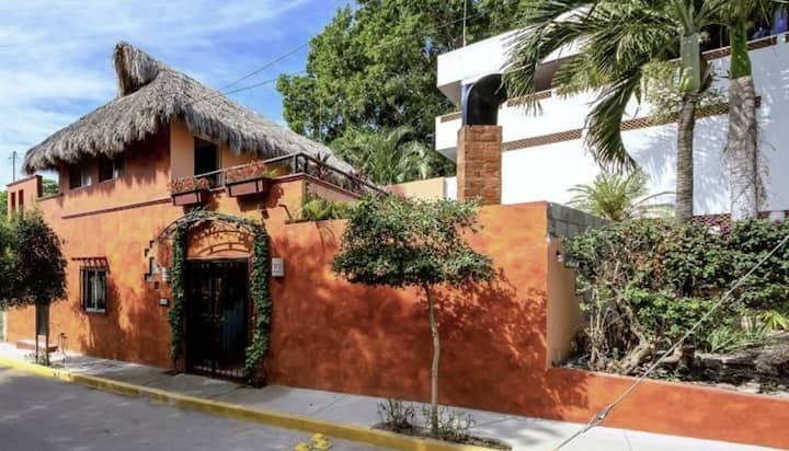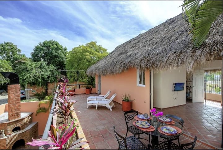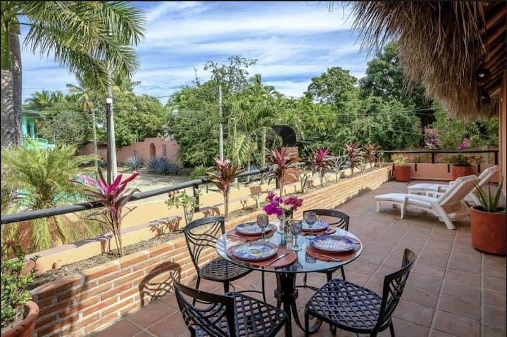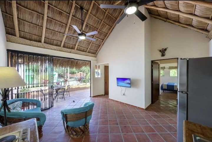 Mlango wa kujitegemea wa chumba cha Palapa, sakafu nzima ya juu iliyo na jikoni / sebule iliyo wazi, baraza kubwa na chumba cha kulala kikubwa mno.