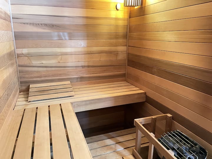Pata uzoefu kama utulivu wa spa ulio kwenye ghorofa kuu karibu na vyumba 3 vya kulala. Bafu hili lina sauna yako binafsi, ubatili wa asili wa mawe, marekebisho maridadi na bafu la kioo lenye nafasi kubwa lenye ukuta na kinyunyizaji cha mikono.