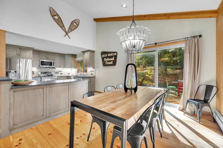 Ingia katikati ya Nyumba ya Hygge, ambapo sebule inakualika upumzike kwa starehe ya hali ya juu. Utazama kwenye sofa za Crate na Pipa zilizojaa, zinazofaa kwa ajili ya kupumzika kando ya meko ya mawe. Wakati wa miezi ya joto, nyumba ina AC, ikihakikisha mahali pa kupumzika penye baridi na starehe baada ya siku ya matembezi ya msimu wa joto. Kuta zilizopambwa kwa mavazi ya theluji ya kale, na kuongeza mguso wa haiba ya kijijini kwenye sehemu ya kisasa. Angalia kupitia madirisha makubwa kwenye msitu unaozunguka, ambapo unaweza kupata mwonekano wa wanyamapori wa eneo husika kama vile kulungu, mbweha, ng 'ombe wa ardhini, dubu, au kasa wa porini wanapopita. Kwa wale wanaotafuta kona tulivu, kuna sehemu nzuri ya kusoma iliyo na mablanketi yenye joto, bora kwa ajili ya kupumzika na kitabu. Ikiwa kazi itakuhitaji wakati wa ukaaji wako, dawati limewekwa mahali pazuri katika sehemu hii tulivu na kwa intaneti ya Mbps 300, unaweza kupokea simu za video kwa urahisi ukiwa na mandhari ya kuvutia huku ukifurahia likizo yako ya Vermont.