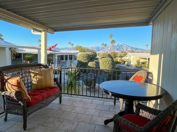 Sitaha ya mbele ya chumba cha mbele ina eneo zuri la kukaa linalofaa kwa kinywaji ili kufurahia machweo mazuri juu ya Milima ya San Jacinto.