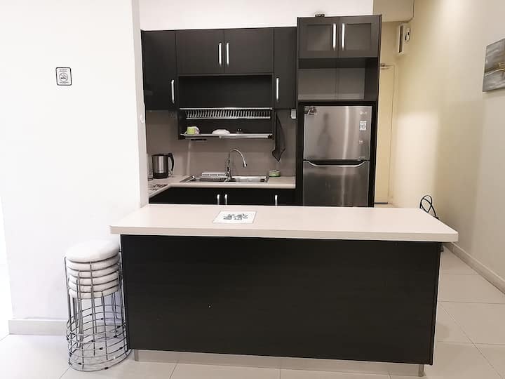 Ubunifu wa nyumba ya nyumbani ni rahisi na wa kifahari, kwa hivyo unaweza kukaa kwa starehe na kuna roshani.Nyumba hii iko katika maduka maarufu ya ununuzi ya Kota Kinabalu -IMAGO Times Square, ambayo ni maarufu kwa wasafiri.
