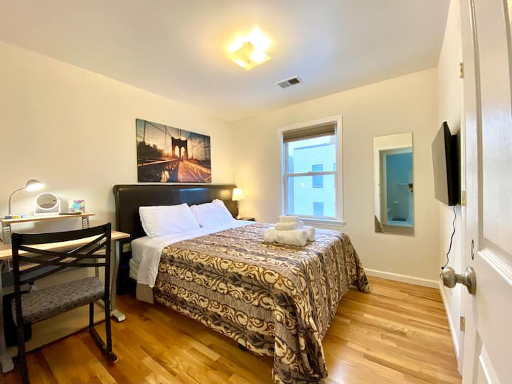 Safi, faragha, utulivu, salama chumba cha kulala kwa 1~2 watu / Kubwa 4 BR 2 BA ushirikiano ghorofa / Screened kufanya kazi chumba cha kitaalamu/ karibu na kituo cha basi/utulivu mitaani wa Jersey City / Bus dakika 30-35 kwa Time Square, dakika 11 kwa Journal Square, kisha kuchukua NJIA ya treni kwa Hoboken, WTC & Manhattan downtown / Kulipwa maegesho inapatikana / Grocery, migahawa, nk ni karibu / Malkia kitanda, smart TV, dawa, chumbani, chumbani, bafuni safi, jikoni kujaa, WIFI, washer & dryer, kati joto & AC / 28+ siku kukaa tu