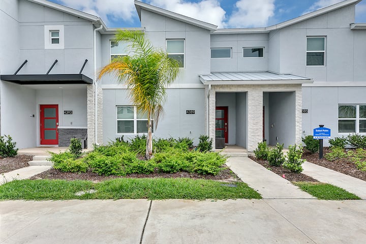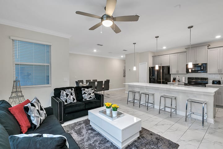 Kukaribisha watu 10 kwa urahisi, sakafu iliyo wazi hutoa nafasi inayohitajika sana kwa likizo yoyote. Jiko lenye nafasi kubwa limejengwa kikamilifu na vitu vyote muhimu. Chumba cha kulia kina eneo la kawaida la kulia chakula la watu 6 pamoja na baa ya kifungua kinywa iliyo na viti 4. Pitia milango ya kioo inayoteleza kutoka sebuleni hadi kwenye oasisi ya bwawa la kujitegemea, iliyochunguzwa kabisa ikiwa na viti vya nje, vinavyofaa kwa ajili ya kupumzika baada ya siku ndefu kwenye bustani za mandhari.