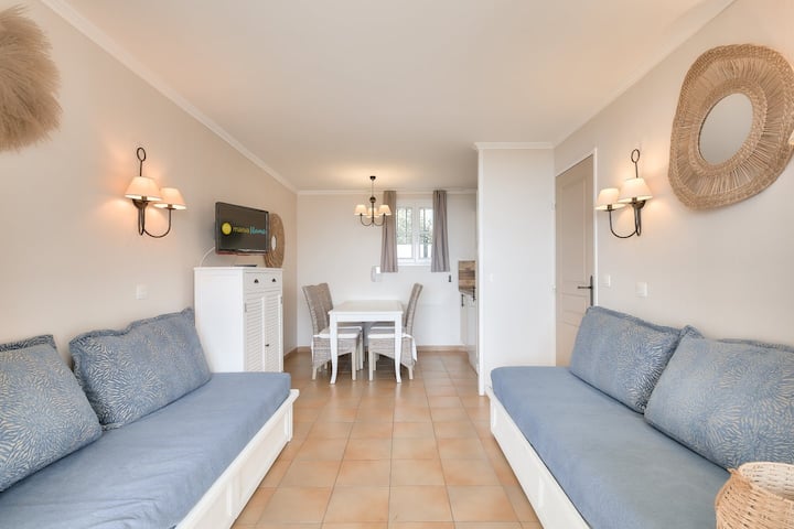 Upangishaji wako wa likizo unajumuisha sebule 1, jiko 1, vyumba 2 vya kulala, mabafu 2, choo 1, mtaro 1 uliofunikwa na sehemu 1 ya maegesho iliyofunikwa.