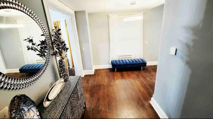 Dapper na dainty, chumba cha kulala cha maridadi kina kitanda cha ukubwa wa King kilichopambwa na King Serta Sertapedic mito, kigari cha mvinyo cha kioo cha chic na glasi, sanaa ya kisasa inayovutia macho, kioo cha mwili chenye urefu kamili, na Runinga kubwa ya 4K 4K High-Definition Smart TV iliyo na programu 20+ na idhaa zaidi ya 1000.