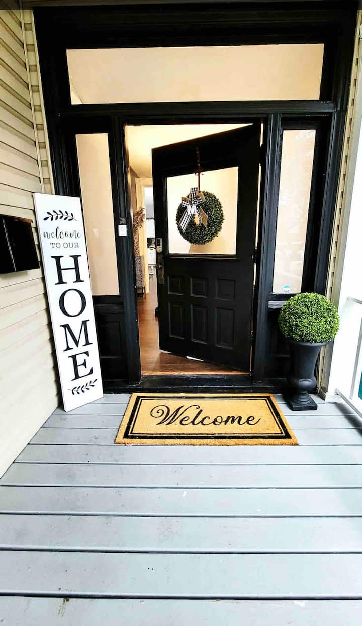 Kikiwa na vivutio vya kifahari vya kale na mtazamo mzuri wa jiji, chumba chetu cha kulala cha anga kimewekewa kitanda cha godoro la ukubwa wa King kilichojazwa na mito ya King Serta Sertapedic, kioo cha mwili cha urefu kamili, kabati la mwalikwa/kabati la armoire, spika ya dari ya Bluetooth, bafu kamili ya maridadi na bafu ya mtindo wa Kirumi ya kutembea ndani ya bafu, kioo cha kupendeza cha taa. Mwishowe, wewe na furushi lako dogo la furaha mnaweza kupumzika katika kitalu chetu kilichotulia kilicho na meza ya kubadilisha mwalikwa, kiti cha kubembea, kifurushi cha kuchezea, na zaidi.