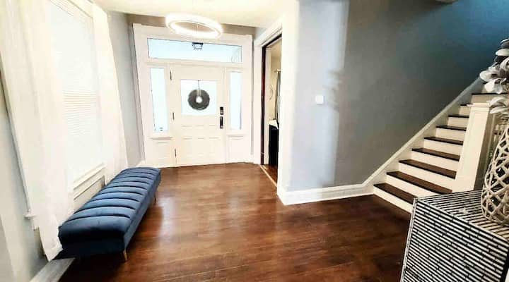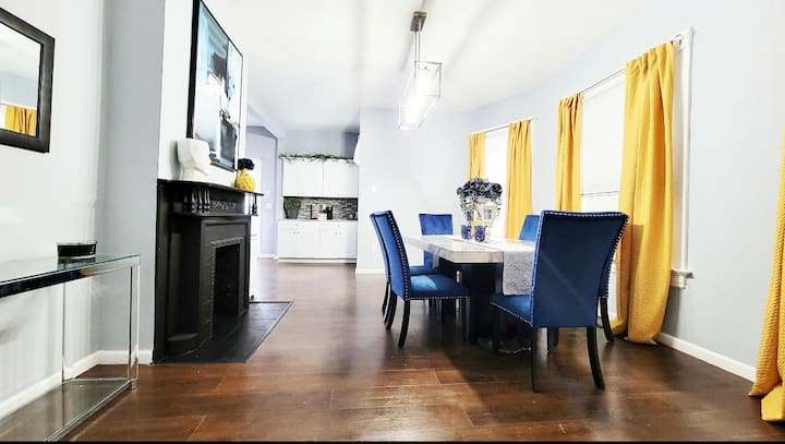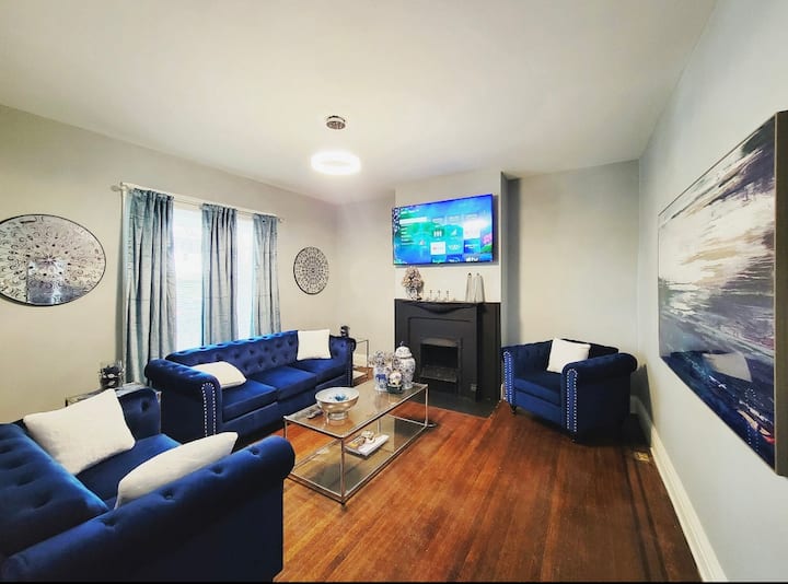 Keti kwenye benchi letu la kisasa la velvet, piga teke viatu vyako, na uache wasiwasi wako mlangoni! Zaidi ya chandelier ya kioo, utajikuta karibu na foyer kubwa. Sebule ya kisasa ya kisasa ya mavuno inapita na ziada. Vuta nyuma mapazia marefu ya bluu ya velvet, chukua kiti kwenye sofa za bluu za kifalme au vitafunio, na ustarehe na mito laini ya lafudhi huku ukitazama vipande vya kushangaza, lakini vya kuvutia, vya sanaa na taarifa. Mwishowe, tembea kwenye filamu uipendayo kwenye 65-katika. 4K Ultra High-Definition Smart ROKU TV iliyopangwa na programu zaidi ya 20+ na vituo vya 1000+.