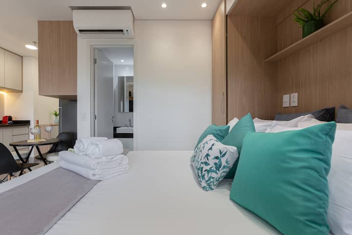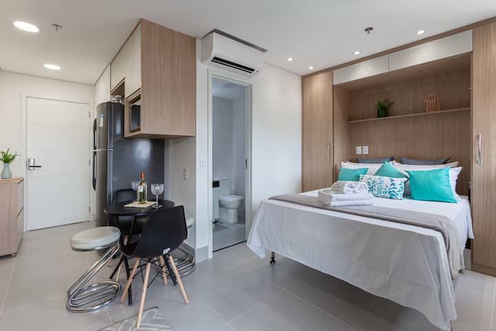 Urahisi wa jiko letu lililo na vifaa kamili huinua tukio la kukaribisha wageni. Furahia kuandaa milo uipendayo katika sehemu ya kisasa ya kupikia ya kisasa ya 2 ya kuchoma kwa kutumia vyombo vya hali ya juu vya Tramontina. Oveni ya umeme, minibar na mikrowevu husaidia tukio la upishi, kwa urahisi na uwezo wa kubadilika wakati wa ukaaji wako huko São Paulo.