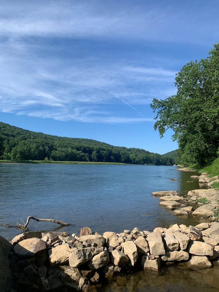 Sisi ni Amy na Joe , mawakala wa mali isiyohamishika. Tulikuwa tunatafuta "Hideaway" kando ya Mto Allegheny wakati 488 ilipojitokeza! Mimi na Joe tumekuwa tukifanya kazi ili kusasisha "The Hideaway" tangu 2020. Hideaway imekuwa nyumba yetu ya pili .Tunatarajia wageni kuipenda na kuijali kama ilivyo nyumbani wakati wa ukaaji wako. Gati limewekwa kwa ajili ya majira ya joto. Vyumba viwili vikuu vya kulala vina joto na sehemu yake ya kupasha joto. Jiko la zamani ambalo Joe alirekebisha ni gesi, na staha, kuta za mawe ya banda na ngazi zinazozunguka nyumba na chini ya Mto ni vipendwa vyetu.