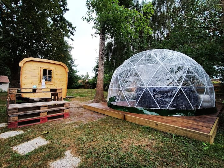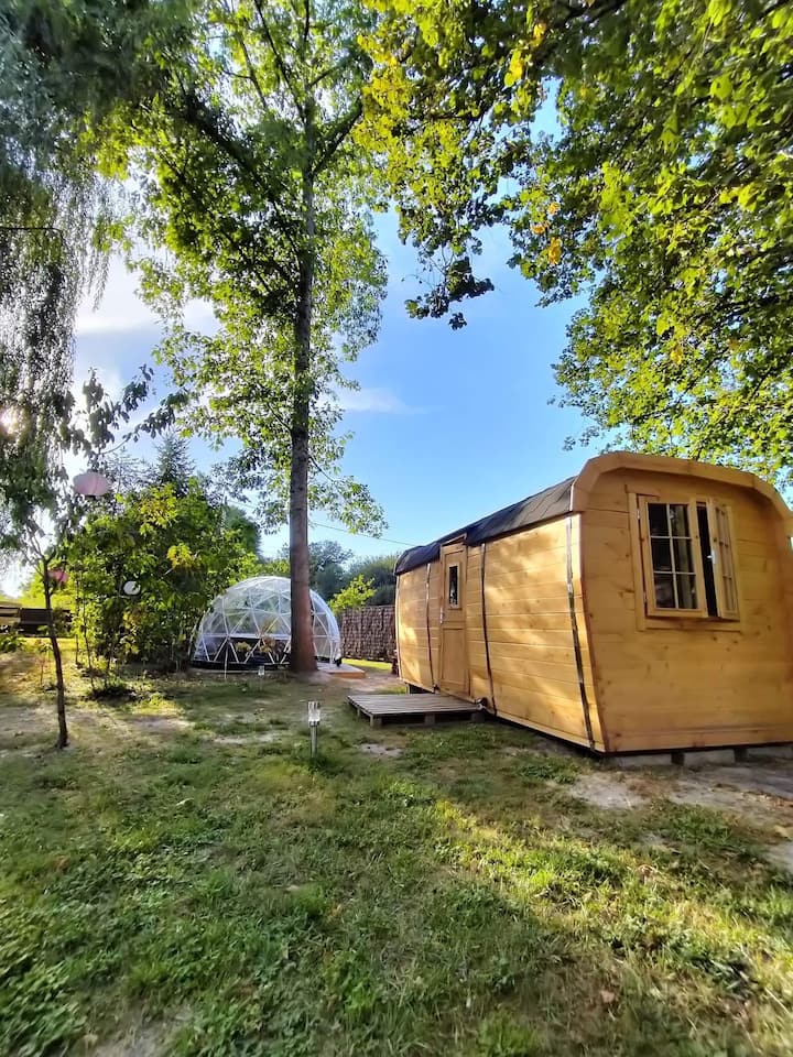 Chalet ya mabasi ya kupiga kambi yenye beseni la maji moto chini ya kiputo