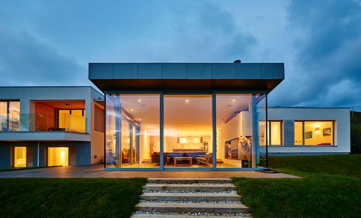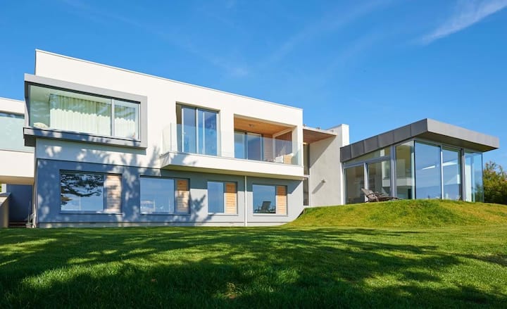 Kulingana na muundo wake wa kisasa, nyumba ina maeneo makubwa ya kuishi yaliyo wazi ambayo hutoa hisia ya nafasi - hata wakati imejaa watu wazima na watoto. Sebule iko karibu na jiko kubwa na atriamu na kuna pango tofauti la watoto lenye tenisi ya meza na chumba cha televisheni upande wa magharibi wa nyumba.