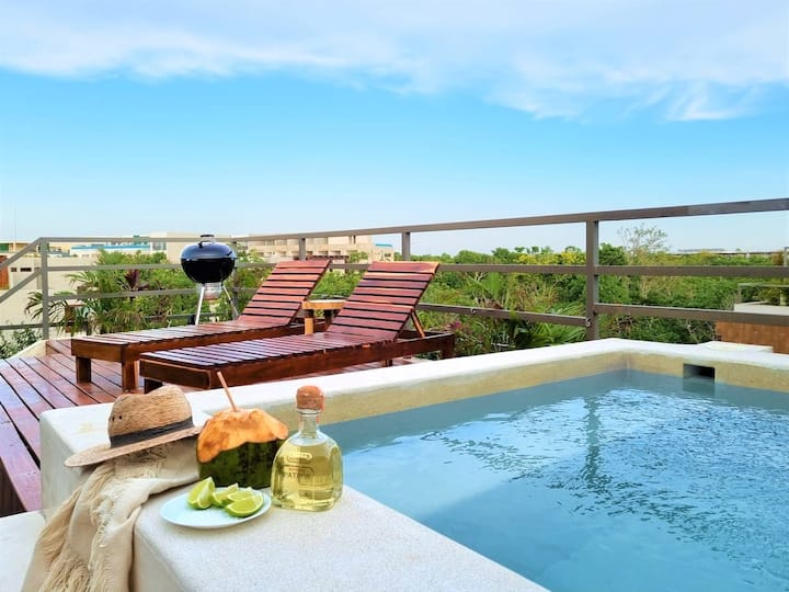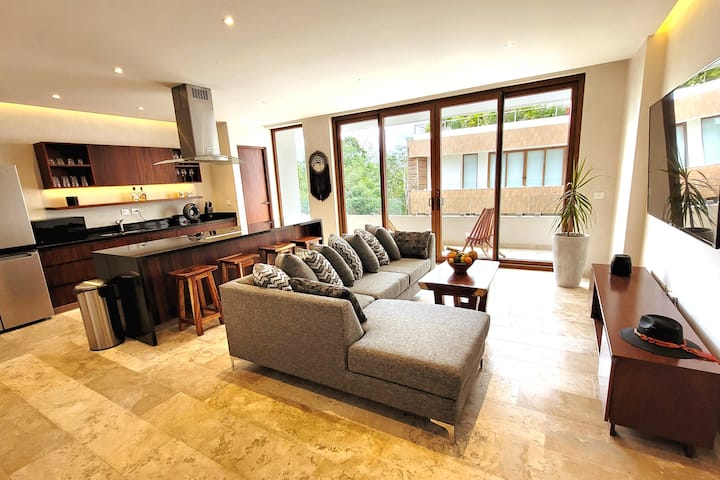 Inalala hadi wageni 6, Wi-Fi, AC, Jiko, vyumba 2 vya kulala, mabafu 3.5. Dakika 5 tu kutoka katikati ya jiji na dakika 10 kutoka kwenye fukwe bora huko Tulum kwa gari.