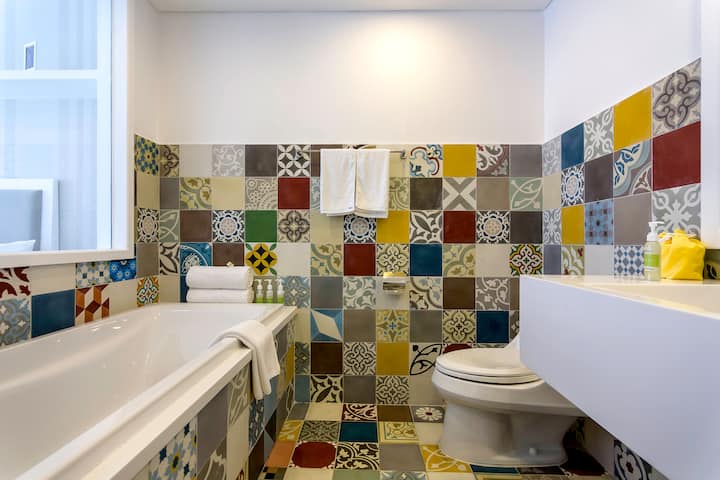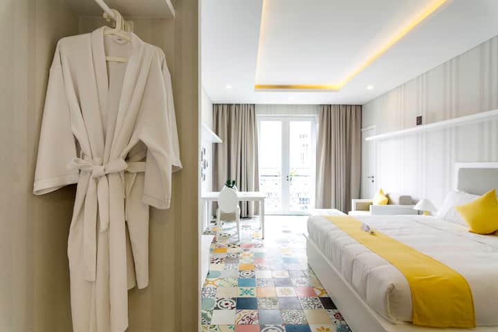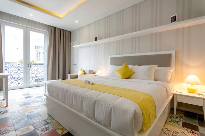 Muundo ni mtindo wa kikoloni wa Kifaransa. Wageni wengi wanapenda vigae vyetu vya sakafu ambavyo vimetengenezwa kwa mikono nchini Vietnam. Vigae hivi vilikuwa maarufu sana nchini Vietnam miaka mingi iliyopita. Chumba kimepambwa upya, ni safi. Nilichagua rangi ya mandhari kwa kila aina ya chumba na ninazingatia kulinganisha rangi sawa kwa vitu vingine vya mapambo. Ilichukua muda mwingi kwa maelezo haya lakini tunaridhika sana na bidhaa ya mwisho. Mkahawa/Mkahawa ni wa kipekee sana katika rangi za pasteli.