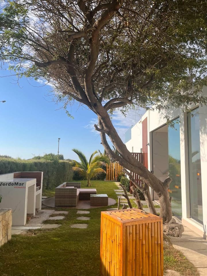 Casa VerdeMar huko Vichayito Peru ilibuniwa na mimi kama mojawapo ya mambo ninayopenda. Ubunifu huo ulifikiriwa kwa wageni wangu ambao hawafurahii tu bahari, maji yake ya joto na mchanga, lakini pia nyumba ndogo, yenye starehe yenye mandhari nzuri ya mandhari kuu, bahari na maeneo yetu ya kijani kibichi. Hivi ndivyo jina VerdeMar lilivyozaliwa, tofauti kati ya bahari na mimea inayozunguka usanifu wa nyumba.