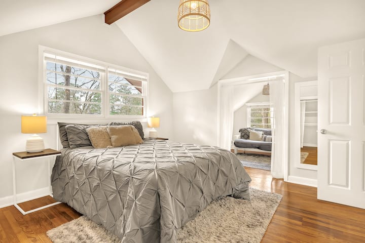 Vyumba vyote viwili vya kulala ni pamoja na vifaa vya starehe vya malkia, godoro la kupumzikia, Roku