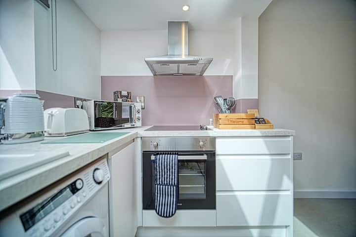 Nyumba hii nzuri ina jiko lililo wazi lenye vifaa kamili ambalo linajumuisha sinki iliyo na droo, friji, friji, mashine ya kuosha vyombo, cafetière, oveni ya umeme na hob iliyo na feni ya dondoo, oveni ya mikrowevu, birika na toaster.