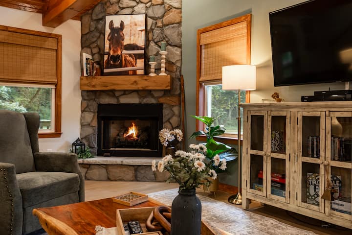 Njoo ufurahie kahawa yako ya asubuhi katika chaguo lako la mipangilio - ukumbi wa mbele wenye mwonekano wa mbao na ukumbi, uliochunguzwa nyuma wenye kivuli kwenye ukumbi au staha ya nyuma yenye jua ukiwa na mwonekano wa kuvutia wa mto! Oga jua kwenye viti vya kupumzika vyenye starehe na ule nyama yako iliyochomwa hivi karibuni uliyopika kwenye jiko la gesi lililotolewa. Usiku furahia muda mzuri wa kushikamana na marafiki au familia yako karibu na kitanda cha moto baada ya kuzama kwenye beseni la maji moto. Kuni hutolewa!