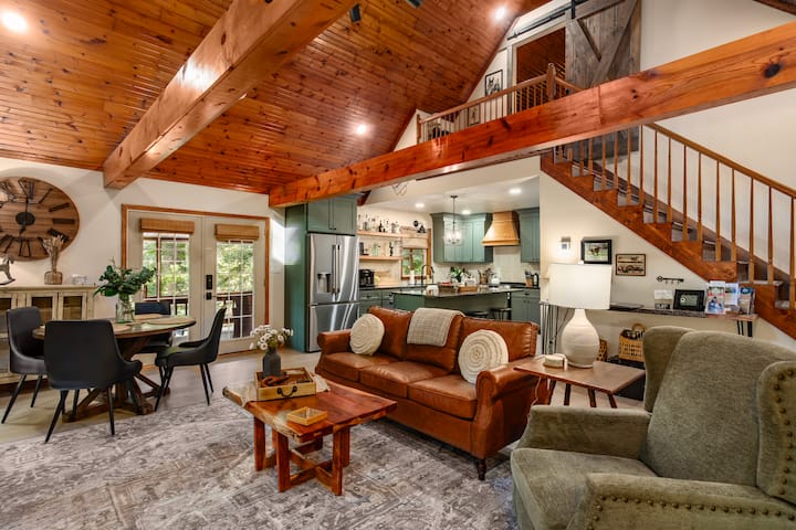 Nyumba hii ya mbao iliyokarabatiwa hivi karibuni ina vistawishi vya kisasa, fanicha mpya, mapambo mazuri na sehemu ya kutosha ya burudani ya nje. Hata ingawa uko katikati ya msitu, hutakuwa ukiufunga hata kidogo! Nyumba imewekwa vizuri na vyumba 2 vya kulala, kimoja kina kitanda cha ukubwa wa kifalme na kimoja kina kitanda cha ukubwa wa kifalme. (Bafu liko kwenye ghorofa ya 1 karibu na chumba cha kulala cha malkia). Inafaa kwa wanandoa mmoja au wawili wanaosafiri pamoja, likizo ya marafiki au familia ya watu wanne ambao wanahitaji muda mzuri!