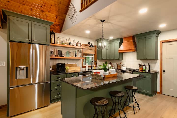 Vistawishi katika jiko lililo na vifaa kamili ni pamoja na maji yaliyochujwa kupitia friji, mashine ya kuosha vyombo, jiko la umeme na mikrowevu. Vifaa vidogo pia vinajumuishwa kama vile blender, sufuria ya mamba, chuma cha waffle na kibaniko. Chungu cha kahawa kilicho na Keurig na sufuria ya ukubwa wa kawaida hutolewa pamoja na vikombe vya k, vitamu, malai na chai. Taulo za karatasi, nguo za vyombo, kitambaa cha vyombo, taulo ya vyombo, sabuni ya vyombo, mifuko ya kufuli ya zip, chumvi, pilipili, mafuta ya kupikia, rafu ya viungo na vitambaa pia vimetolewa. Je, unahitaji vipande vya barafu vya mviringo kwa ajili ya bourbon uliyonunua hivi karibuni? Hakuna shida! Jokofu letu hufanya vipande vya barafu vya mviringo viwe bora ili kuweka bourbon yako au chai ya barafu kuwa nzuri na baridi! Glasi za Bourbon ziko kwenye kabati pia!