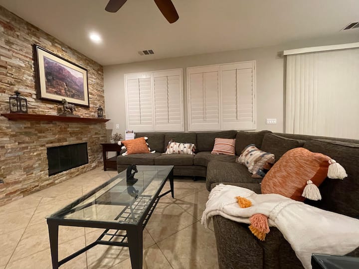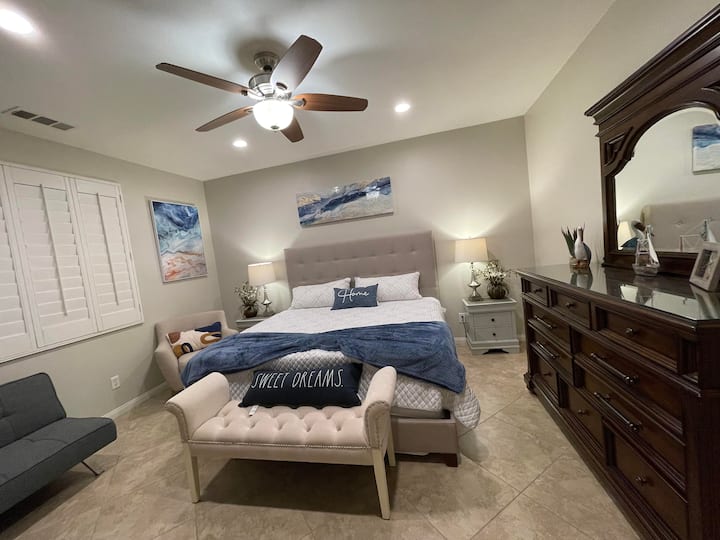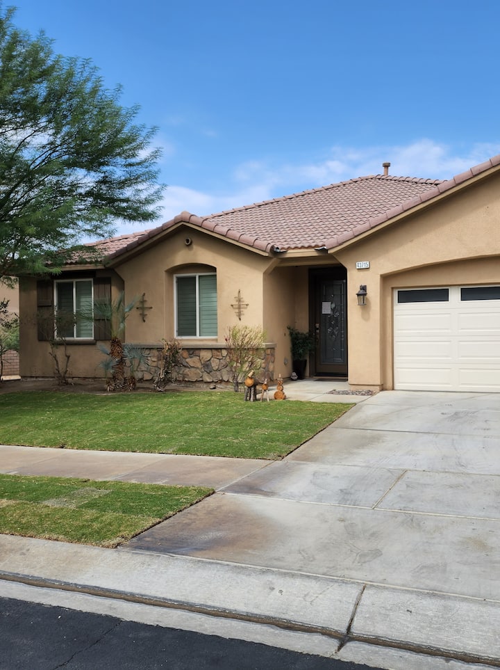 Sahau wasiwasi wako katika sehemu hii yenye nafasi kubwa na tulivu. Nyumba iliyochapishwa hivi karibuni katika jumuiya maarufu ya Terra Lago. Nyumba hii nzuri yenye nafasi kubwa ina zaidi ya 2100sqft ya sehemu ya kuishi iliyo wazi, yenye vyumba 4 vya kulala na mabafu 2 ya kukukaribisha wewe na wageni wako. Nyumba ya kupumzika sana iliyo na bwawa/spa ya kujitegemea na eneo dogo la gofu. Tumia wakati mzuri na familia yako na marafiki katika nyumba hii iliyo na samani kamili na vifaa kamili na kila kitu unachoweza kufikiria. Nyumba iko umbali mfupi wa kuendesha gari (dakika 8) kwenda Coachella, Stagecoach, Sherehe za Safari za Jangwa- na Klabu ya Empire Polo. Takribani: Dakika 8-10 kwa Bustani za Tenisi za Indian Wells na Takribani: Dakika 15-20 hadi katikati ya mji wa Palm Springs. Umbali wa kutembea wa Kasino ya Fantasy Springs na chakula kizuri.