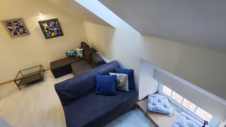 Fleti yetu ina sebule angavu yenye mwonekano wa anga wa aina ya jiji na kitanda cha sofa. Jiko letu lina vifaa vya kutosha kwa ajili ya kupika nyumbani.