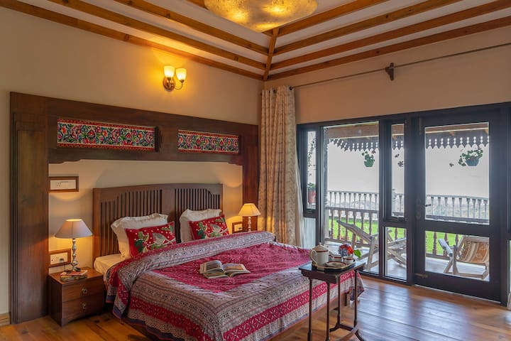 - Vyumba vyote viwili kwenye ghorofa ya kwanza vina roshani ya kipekee iliyo na mwonekano wa ua wa nyuma wa vila uliojaa maua na mabonde mazuri yenye mandharinyuma ya milima ya Himalaya yenye kuvutia.
