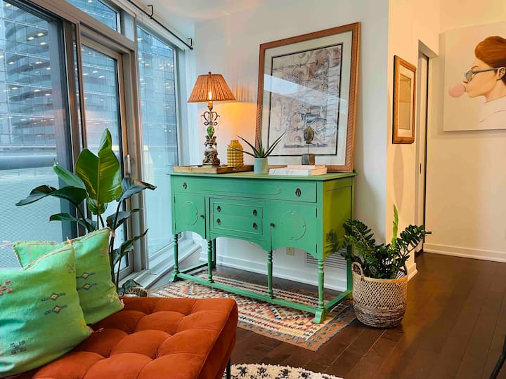 hiyo ina kochi la kijani kibichi na kiti cha pembeni ambacho kina wageni 4 kwa starehe. Jizungushe na mimea ya kitropiki na bidhaa zilizoingizwa kama vile mazulia ya Moroko na meza mahususi ya kahawa ya mbao iliyochongwa. Furahia kahawa yako ya asubuhi ukiwa na mtazamo wa mnara wa CN, au pumzika kabla ya kuelekea kwenye mchezo wa Raptors.
