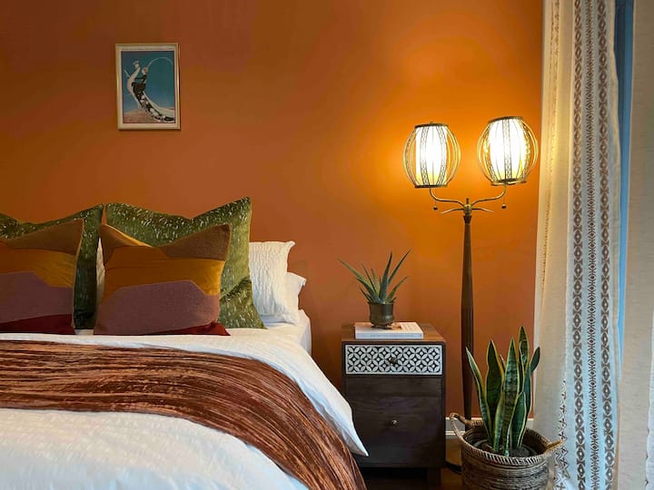 Joto la rangi ya chungwa katika chumba hiki cha kulala huonekana kama umeingia katika kuta za jiji la Marrakech. Ikiwa na kitanda cha kifahari cha malkia kilicho na mashuka meupe, kitakuwa cha kulala kizuri ambacho umekuwa ukitamani. Pumzika chini ya taa ya kucheza ambayo inabonyeza kutoka kwenye taa ya shaba ya Moroko. Ukiwa na ufikiaji wa moja kwa moja wa bafu na roshani, chumba hiki cha kulala cha msingi ni
