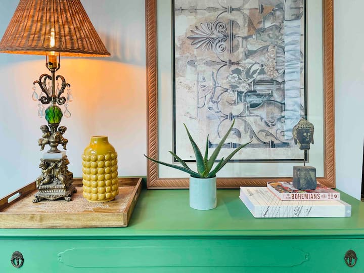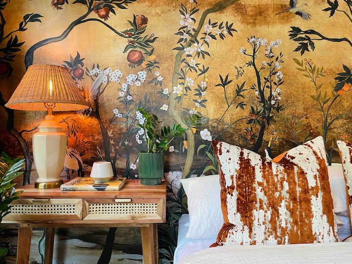 Karatasi ya ukutani iliyobinafsishwa pamoja na mimea ya kitropiki hutengeneza oasisi katika chumba cha kulala. Madirisha ya sakafu hadi dari yaliyo na kitanda cha malkia chenye mashuka meupe na mazulia ya sufu chini ya vidole vya miguu. Madirisha yamefunikwa na mapazia ya rangi ya kijani ya velvet kwa ajili ya faragha. Chumba hicho pia kina runinga janja na kabati kubwa la kuhifadhia makabati na kutundika nguo zako.