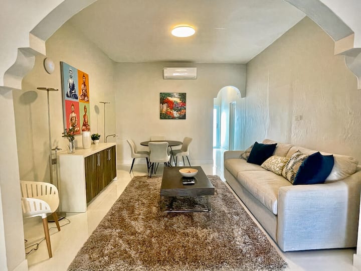 Kaa nyuma na uungane na marafiki na familia kwa kutumia Wi-Fi ya bila malipo. Utapenda sanaa ya kupendeza na mapambo ya kupendeza, kutoa hisia ya kifahari ya fleti hii nzuri. Kuna eneo la pili la kupumzikia kwenye ukumbi. Sehemu hii inapokea mwanga mwingi wa asili kupitia madirisha makubwa na ina televisheni kubwa yenye skrini bapa ili uweze kufuatilia vipindi na sinema zote unazozipenda.
