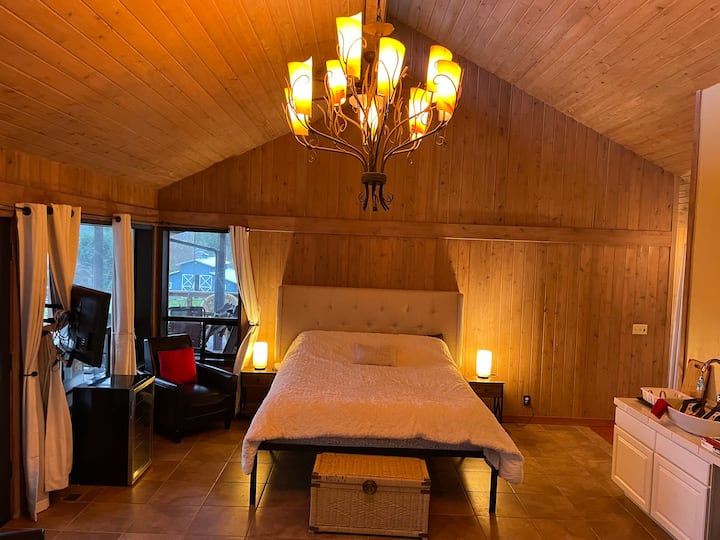 Tuko kwenye ekari 12 za ardhi iliyotenganishwa kwenye vifurushi viwili ambavyo vimeunganishwa na njia moja ya kuendesha gari. Kuna vitengo 5 kwenye nyumba ya chini na 1 upande wa juu. Njia ya gari imesainiwa na mishale ya mwelekeo wa kitengo na majengo pia yamesainiwa kwa jina la nyumba kwenye au karibu na mlango. Beseni la maji moto, nje ya bafu linashirikiwa na wageni. Ni nyumba kubwa ambayo ina wanyama wa shambani. Nyumba ina lango la mali isiyohamishika lenye msimbo ambao utapokea kwa barua pepe siku moja kabla ya kuwasili.