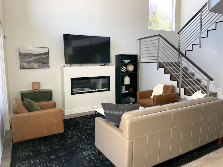 Sebule: Chumba kizuri kilicho wazi kinachoangalia La Sals, kina dari za futi 18. Inafaa kukusanyika ili kucheza michezo, au kutazama televisheni kwenye televisheni yetu mahiri ya inchi 70, pamoja na Netflix, Disney na Hulu/ESPN. Sehemu nzuri ya kuotea moto ya mbali, ina chaguo la kupuliza joto, au moto tu wa kawaida au wa bluu!
