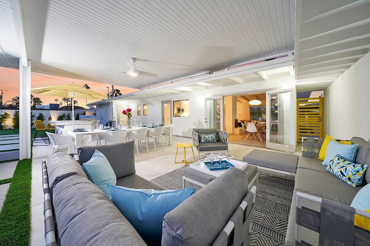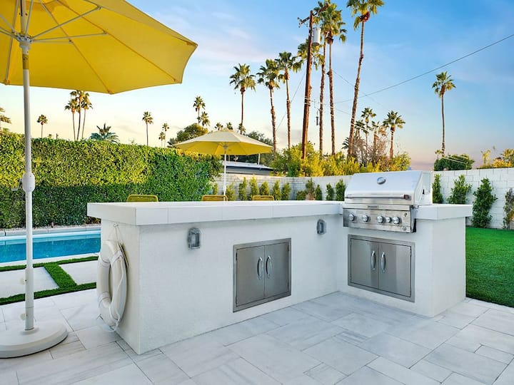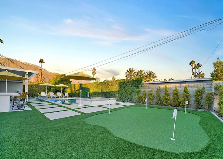 oasis ya kushangaza ya Palm Springs haingeangaza katika utukufu wake wote bila nafasi ambapo unaweza kupumzika kikamilifu na kufurahia utulivu wa nje ya kupendeza. Fanya kazi kwenye mchezo wako wa kuweka, na uende kwenye bwawa la kuogelea la kifahari na beseni la maji moto kabla ya kupumzika na kutazama anga lenye nyota huku ukipumzika kwenye shimo la moto.