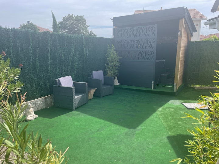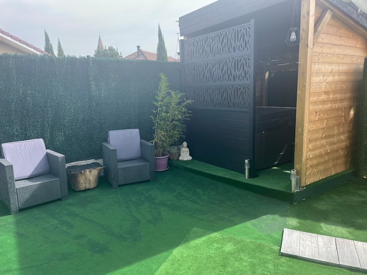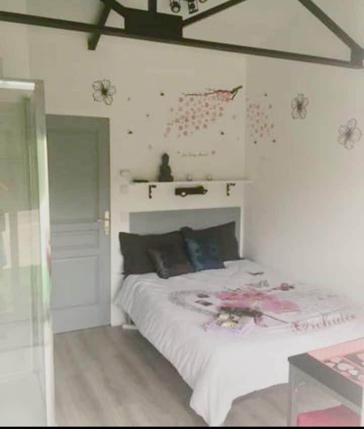 Tunapenda kusafiri ,kukidhi urahisi, ukandaji wa mazingira ya asili, kama wenyeji Tunatoa studio ya Cocooning ya karibu 20 m2 na spa ya kujitegemea na massage ya hiari na nyingine katika chalet ya mbao ya 23 m2 na ardhi ya kujitegemea Katika nyumba yetu lakini inayojitegemea kabisa na inayojitegemea bila kizuizi cha ufikiaji wa raha ya kukukaribisha