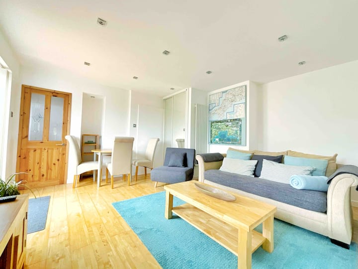 Chumba angavu chenye nafasi kubwa, jua linapita kwenye milango miwili asubuhi/alasiri, taa zinazobadilika rangi hubadilisha sehemu wakati wa jioni. Ina sofa kubwa na yenye starehe ya viti vitatu, TV ya 42", iliyounganishwa na Netflix (akaunti ya mgeni), na Freeview. Hapa pia ndipo utapata meza ya kulia na viti. Katika eneo la kuishi utapata kabati kubwa linalotoa hewa (nyuma ya milango miwili ya kioo yenye urefu kamili), iliyojaa reli na viango vya kuning 'inia, kukausha taulo zako, koti zenye unyevunyevu, buti/viatu, na hata mzigo wa kuosha ikiwa hali ya hewa si nzuri.