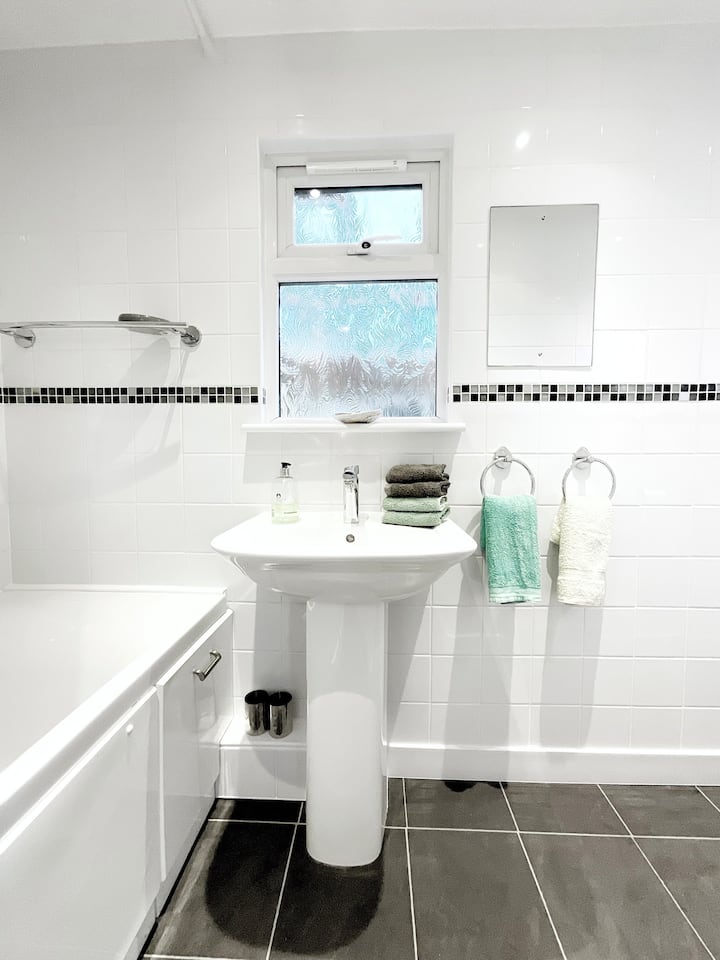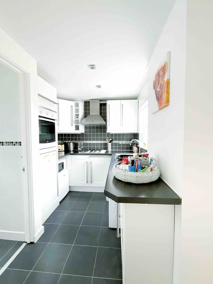 Jiko letu kamili lenye oveni, hob, toaster, birika, microwave, Nespresso Vertuo (na pods), mashine ya kufulia, friji, na jokofu ndogo, lina vifaa vya kutosha na tunatoa kikapu kilichojaa vitu vidogo ambavyo huenda umesahau, pamoja na baadhi ya vitu vya chakula na vitafunio ambavyo vinaweza kuwa muhimu kabla ya duka lako la kwanza. Tafadhali chukua tu kile unachohitaji. Vitambaa vyote vya kuosha, vitambaa, brashi, sponji zinazotolewa. Tunafaa kwa mazingira kadiri iwezekanavyo, tunatoa sabuni ya kuosha kioevu, sabuni ya kufulia na vifaa vya kusafisha, mabegi n.k., vyote vimetolewa. Tunachakata taka za chakula kupitia mpango wa baraza.