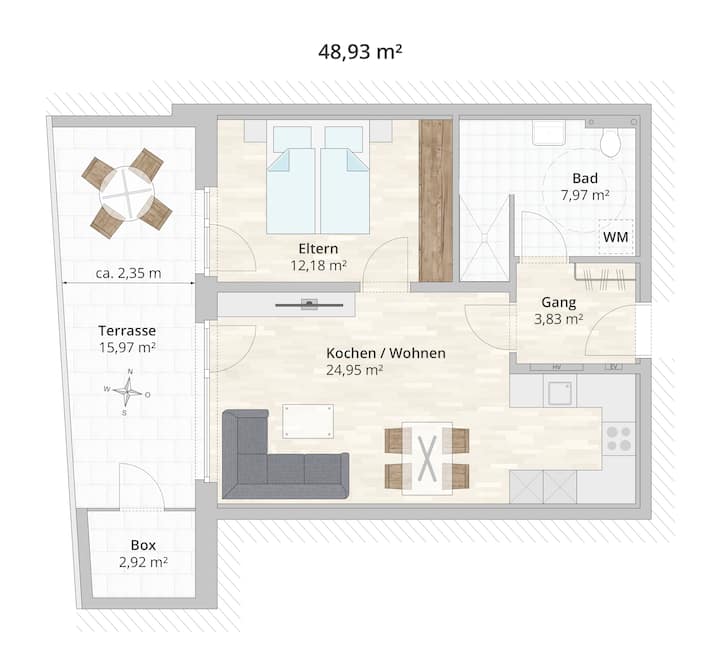Ubora mpya wa ghorofa ya 48 sqm na mtaro mkubwa