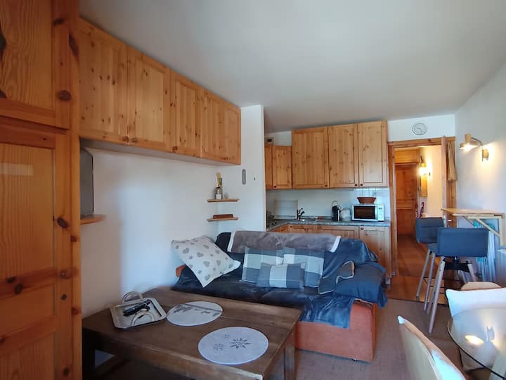 + : Fleti iliyo na mtaro mdogo na mwonekano mzuri wa Janus na miteremko - Usafiri wa skii umbali wa mita 20 kutoka kwenye makazi. Inastarehesha na ni nzuri sana. Makazi madogo yalitunzwa vizuri sana na tulivu sana. Maegesho ya kujitegemea kwenye makazi