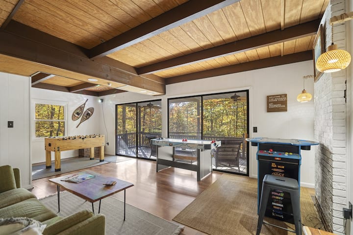 Nyumba ya Mbao ya Starehe katika Eneo la Mapumziko la Bryce Ski, Chumba cha Michezo, Meko