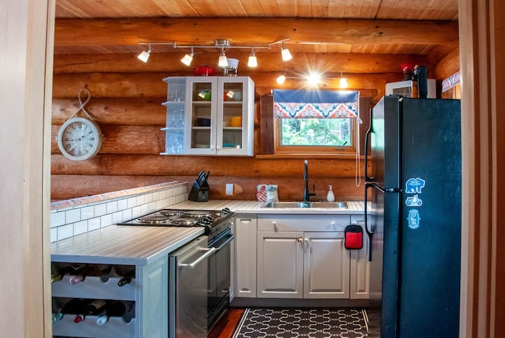 Jiko lina vifaa vyote vikubwa na vidogo ambavyo ungetarajia katika jiko la familia. Utaweza kupiga vitafunio vyepesi au chakula kamili kwa wakati wowote. Kuna usambazaji wa chumvi, pilipili, mafuta ya kupikia na kahawa ili uweze kutumia wakati wa ukaaji wako. Karibu na jiko kuna meza kubwa ya kula ya mbao, benchi ndefu na viti.