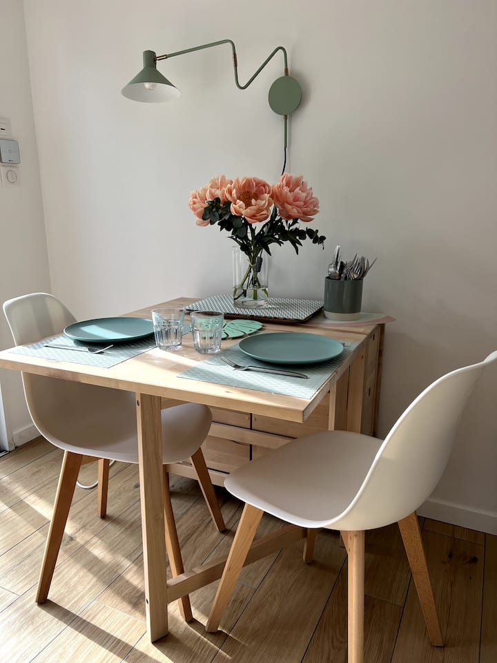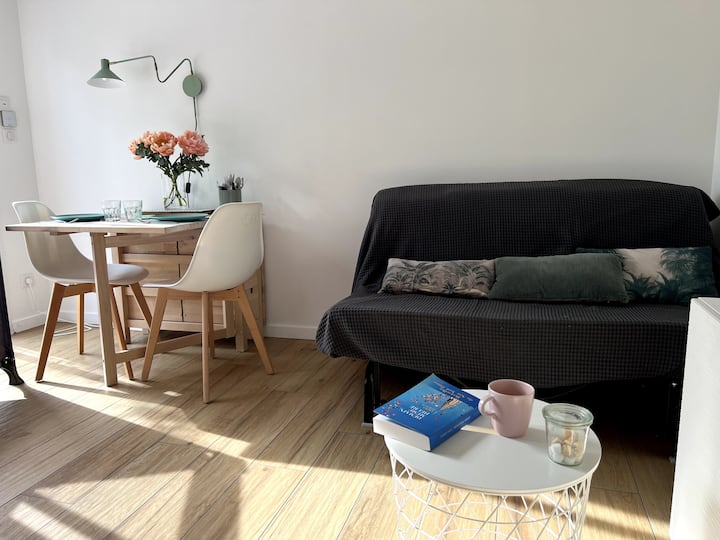 Studio tulivu, yenye kiyoyozi, bustani na maegesho
